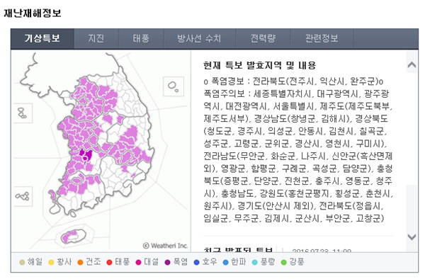 기상청 따르면 주말인 오늘까지 닷새 연속 폭염특보가 발효 중이다. 전국 대부분 지역에 폭염특보가 발효된 가운데 당분간 낮 기온이 33도 내외로 오르면서 무더운 곳이 있을 전망이다.