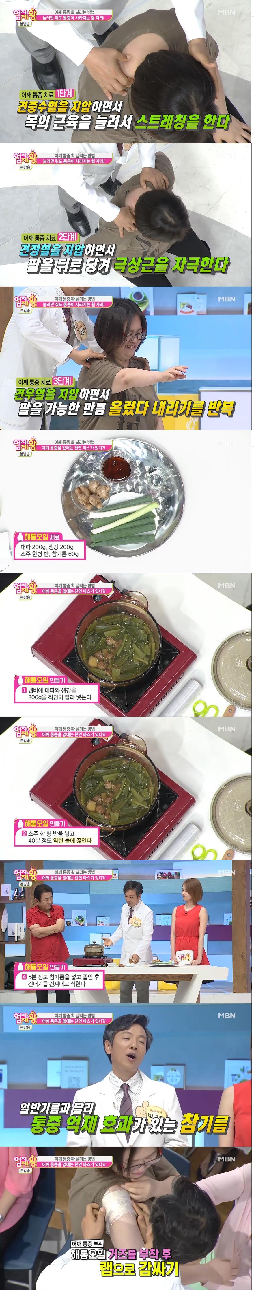 이미지 확대보기26일 밤 방송된 MBN '엄지의 제왕'에서는 '어깨 통증 없이 사는 법' 특집으로 우리가 흔히 오십견으로 알고 있는 병은 대부분 어깨 힘줄병(회전근개질환)이며 어깨 통증을 확 날리는 방법으로 눌러만 줘도 어깨 통증이 사라지는 혈자리 3분 플레이가 소개됐다. 또 집에서 대파와 생강으로 만드는 초간단 천연파스 '해통오일' 만드는 방법이 소개돼 눈길을 끌었다.