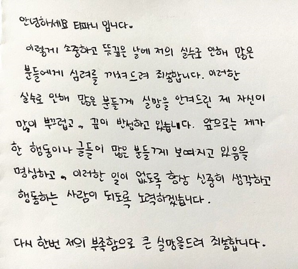이미지 확대보기티파니는 15일 인스타그램을 통해 "이렇게 소중하고 뜻깊은 날에 저의 실수로 인해 많은 분들에게 심려를 끼쳐드려 죄송합니다"라며 자필로 쓴 사과문을 게재했다. 그는 "이러한 실수로 인해 많은 분들께 실망을 안겨드린 제 자신이 많이 부끄럽고, 깊이 반성하고 있습니다"라며 "항상 신중히 생각하고 행동하는 사람이 되겠다"는 글로 마무리했다.