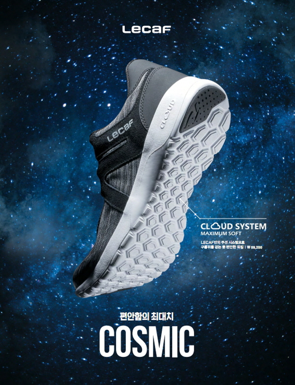 회사측이 따르면 코스믹(COSMIC)은 ‘우주의, 장대한’을 뜻하는 제품명을 사용해 무중력 공간인 우주에서 유영을 하듯 편안하고 가벼운 착용감을 강화한 제품이다. 최적의 쿠셔닝을 제공하는 르까프만의 독자적인 기술인 클라우드 시스템(Cloud System)을 적용해 푹신한 착화감을 구현한 것. 쿠션의 경도를 차등 적용한 기존 제품과는 달리, 워킹화 특성에 맞춰 미드솔 전체에 적용하는 등 쿠셔닝 효과를 한층 업그레이드 하여 더욱 안정적이고 편안한 워킹이 가능하도록 도와준다.