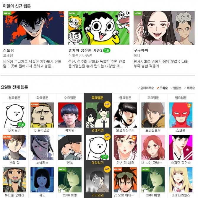 2016년 34주차 기준 각 요일별 조회 순위 1위는 월요웹툰 ‘대학일기’(자까)-18화, 화요웹툰 ‘마음의 소리’(조석)-1052화, 수요웹툰 ‘복학왕’(기안84)-108화, 목요웹툰 ‘연애혁명’(232)-139화, 금요웹툰 ‘외모지상주의’(박태준)-92화, 토요웹툰 ‘프리드로우’(전선욱) 140화, 일요웹툰 ‘스퍼맨’(하일권)-27화이다.