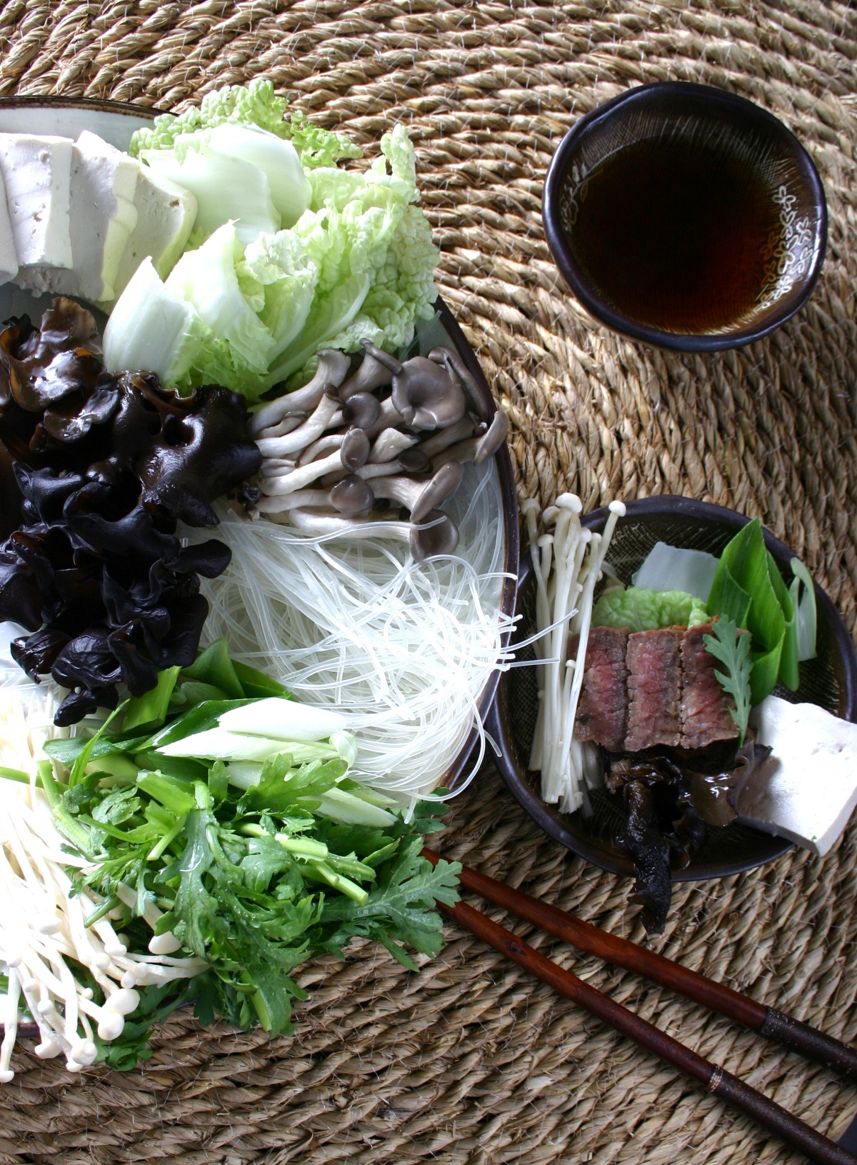 6. 위의 재료를 먹기 좋게 한 접시에 담고 사골 국물을 끓인다.