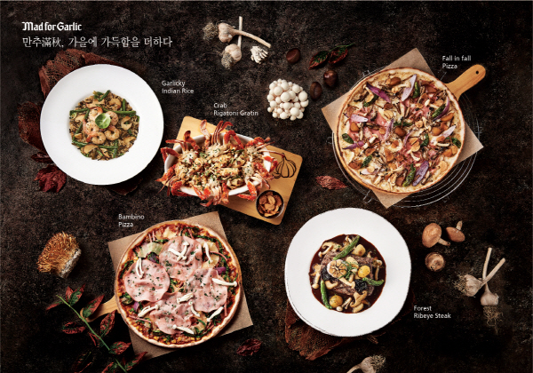 ▲‘폴 인 폴 피자(Fall in fall Pizza)’는 청양버섯크림소스에 이탈리아 정통 모타델라 햄, 꽈리고추, 애느타리 버섯, 만가닥 버섯, 황금송이 버섯과 레드 와인에 졸인 밤을 넣어 풍미를 최대한 끌어올린 것이 특징인 피자다. ▲‘크랩 리가토니 그라탕(Crab Rigatoni Gratin)’는 매콤한 청양크림소스의 리가토니 파스타를 화이트 와인과 청양고추, 마늘을 넣어 볶아낸 꽃게와 바삭한 베이컨 칩, 갈릭 크럼블을 듬뿍 얹어 함께 즐기는 풍부한 맛의 그라탕이다. 마지막으로 ▲‘갈릭키 인디안 라이스(Garlicky Indian Rice)’는 엔쵸비 갈릭오일에 새우, 표고버섯, 그린빈, 미니 양배추, 수제 마늘쫑 피클을 함께 볶아낸 후 다양한 풍미의 와일드 라이스를 더했다.