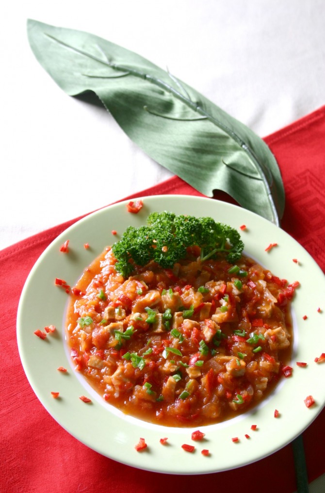 재료: △고기 또는 생선 약 1kg △토마토 2개 △양파 1개 △고추 4개 △매기 큐브 2개(소고기 다시다로 대체 가능) △식용유 △에구시 빻은 것 1C △소금 △물