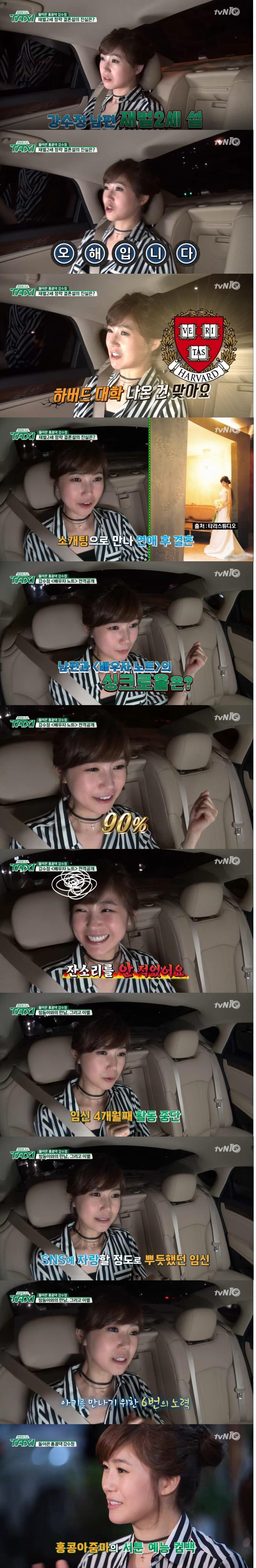 강수정은 "남편은 루머처럼 재벌2세가 절대 아니고 하버드 대학을 나온 것은 맞지만 혼자 열심히 공부해서 일군 사람"이라고 전했다. 두 사람을 이어준 오작교는 최윤영 아나운서로 소개팅을 하고 1년 6개월 정도 된 후에 열애설이 터져서 남편이 엄청 당황했던 사연을 전했다.