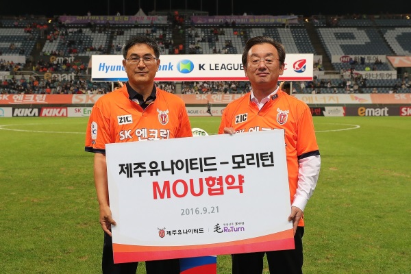 21일 제주월드컵경기장에서 열린 전북 현대와의 현대오일뱅크 K리그 클래식 2016 31라운드 홈경기를 앞두고 열린 이날 협약식에는 이종승 모리앤 회장과 장석수 제주유나이티드 대표이사가 참석한 가운데 진행됐다.