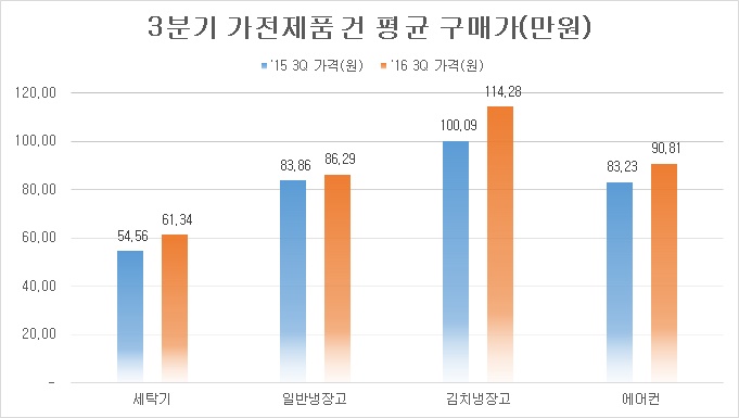 14일 가격비교 사이트 다나와의 조사결과에 따르면, 3분기 생활/계절가전 4종(세탁기, 일반냉장고, 김치냉장고, 에어컨)의 건 평균 구매가는 전년 동기 대비 평균 9%의 증가율을 보였으며, 금액으로는 평균 7만 5400원 상승한 것으로 확인됐다.