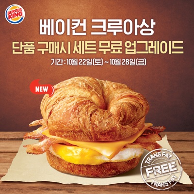 버거킹은 카카오톡 플러스 친구를 대상으로 오는 베이컨 크루아상 단품 구매 시 세트 무료 업그레이드 쿠폰을 증정한다. 킹모닝 세트는 크루아상과 RA 인증 커피 한 잔과 해쉬브라운으로 구성된다. 베이컨 크루아상은 킹모닝 신메뉴로 부드러운 트랜스지방 프리(trans fat-free) 크루아상에 베이컨과 계란 패티, 슬라이스 치즈를 더했다.