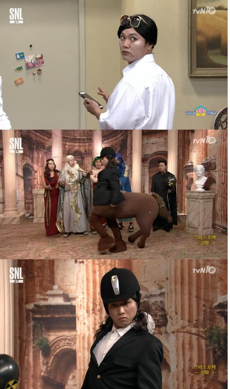 먼저 호스트로 출연한 가수 솔비가 '우주의 기운'을 모은 행위 예술 퍼포먼스를 벌였다. 로마공주 솔비의 남편감을 찾는 그리스로마 신화 콩트에서 유세윤은 켄타우로스로 등장해 신발 한 짝을 찾으러 왔다고 소리쳤다. 유세윤은 최순실 딸 정유라가 말을 타는 기수 복장으로 나타났고 "프라다! 프라다"를 연거푸 외쳐 폭소를 자아냈다.