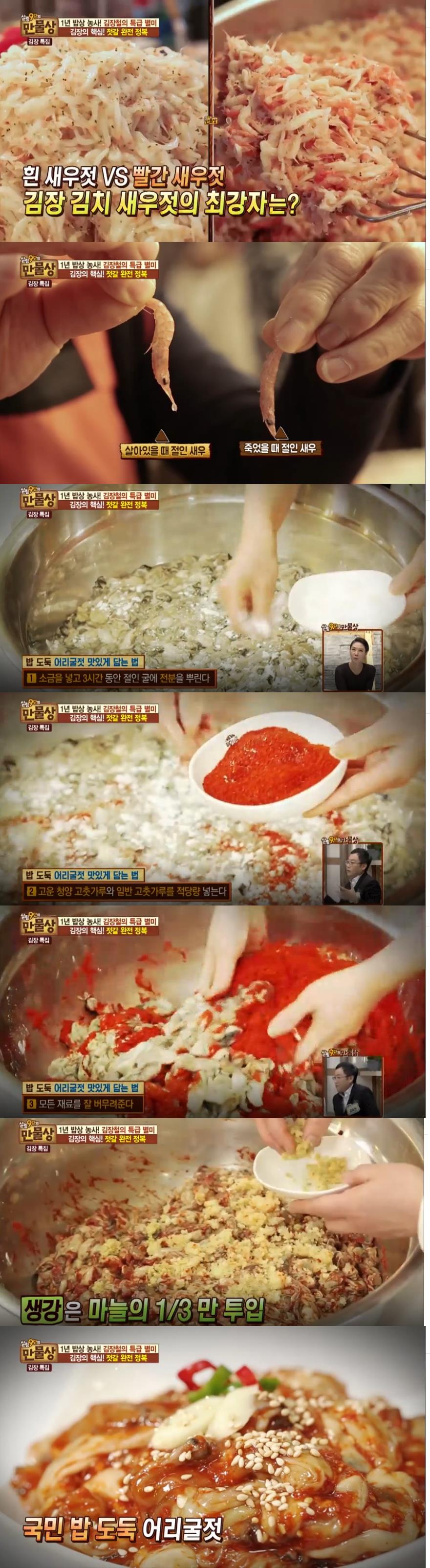 이날 방송에서는 손맛의 달인 박순이 살림구단의 어리굴젓 만들기 비법이 공개됐다. 밥 맛 없을 때 입맛 확 돌아오게 하는 '어리굴젓 만드는 특급 비법'은 다음과 같다.