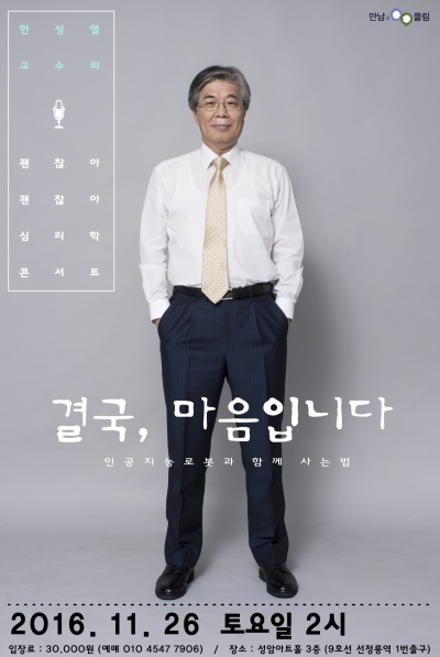 심리학자 한성열 고려대 교수가 여섯 번째 심리학 콘서트 '괜찮아, 괜찮아'를 공연한다. 오는 26일 오후 2시 지하철 9호선 선정릉역 근처에 위치한 성암아트센트에서 '결국, 마음입니다'를 주제로 4차 산업혁명이 몰고온 인공지능 로봇과 함께 사는 법을 안내한다.