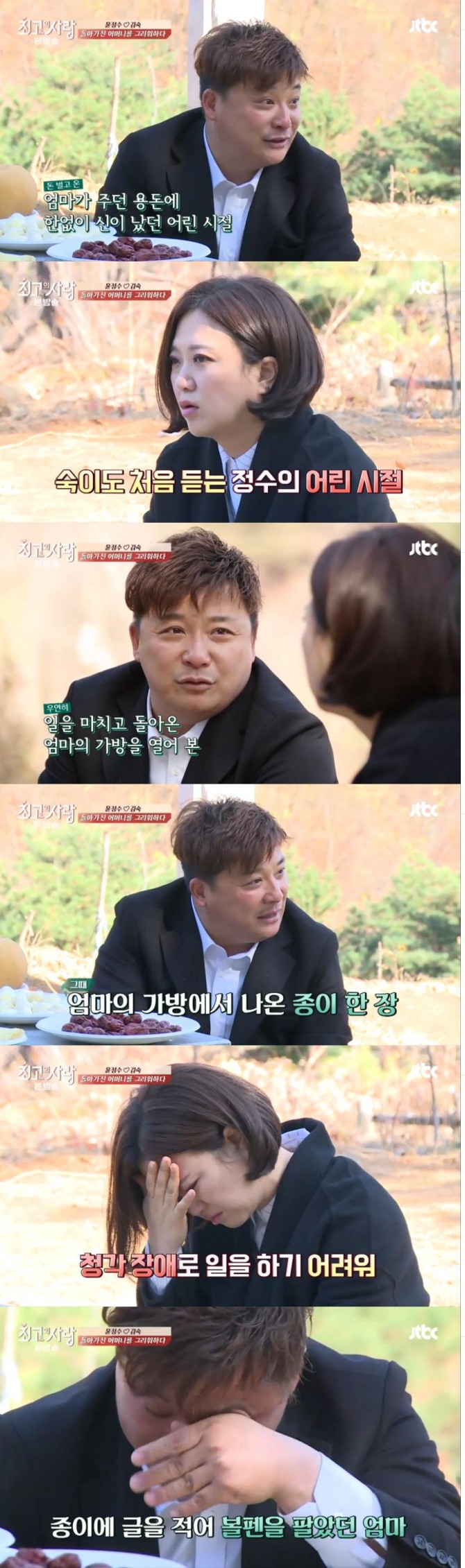 이어 윤정수는 남대문 가방 같은 어머니의 가방 한가득 볼펜이 들어 있었던 게 너무 좋아서 꺼내서 이 주머니 저 주머니에 넣었다는 것. 하지만 가방 한 구석에 들어 있던 종이를 본 윤정수는 울컥 했다고 털어 놓았다. 청각 장애로 일하기 어려웠던 어머니가 종이에 글을 적어서 볼펜을 팔았던 것이다. 윤정수는 "어린 나이에 그걸 안거야. 딱"이라고 말해 김숙과 시청자들을 울렸다. 김숙은 그런 정수와 함께 슬픔을 나누며 공감했다.
