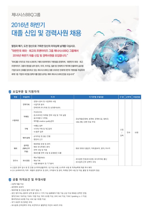 전형은 서류와 1차면접, 인적성 검사, 합숙 및 최종 PT면접을 통해 진행되며 합격자는 치킨대학에 입소해 기초 교육 과정을 이수하게 된다. 교육을 수료한 후에는 1년 간의 S/V(Supervisor) 직무를 필수로 수행하게 되며 직무 능력에 따라 부서를 배치받게 된다. S/V 직무는 가맹점 운영/지도 관리 및 신규매장 개설 지원을 담당한다.
