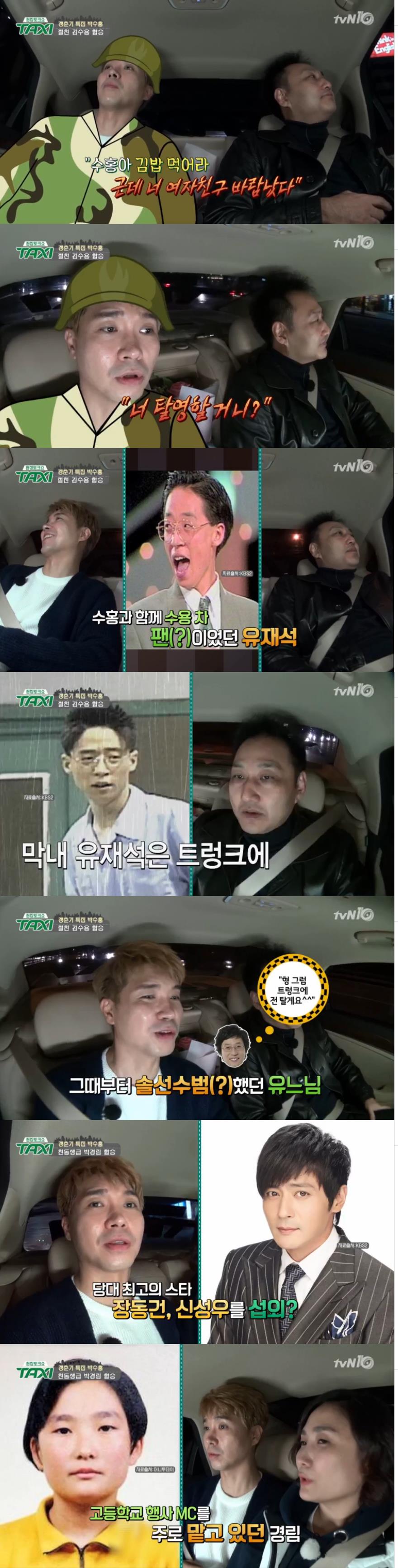 김수용은 당시 전부 신인으로 6명이 탈 때가 있었는데, 막내 유재석을 트렁크에 태웠다는 것. 숨을 쉬도록 문을 살짝 열어두고 유재석이 타고 다녔다며 김수용과 박수홍은 "유재석이 이렇게 뜰 줄 알았으면 앞자리에 태울 걸 그랬다"고 밝혀 더욱 큰 웃음을 선사했다.