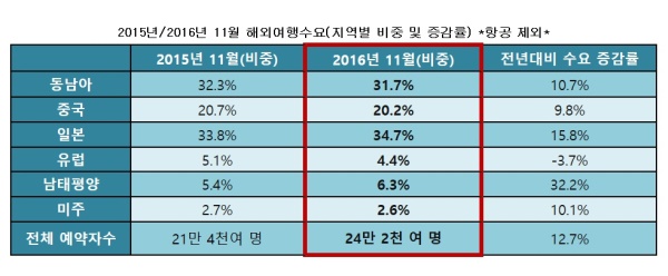 이미지 확대보기지역별 비중은 일본(34.7%) > 동남아(31.7%) > 중국(20.2%) > 남태평양(6.3%) > 유럽(4.4%)> 미주(2.6%)의 순을 나타냈다. 개별자유여행객에게 지속적인 인기를 끌고 있는 일본은 여전히 가장 큰 비중을 유지하는 모습을 보였으며, 겨울시즌이 다가오면서, 따뜻한 동남아 및 남태평양 휴양지의 수요 증가로 인해 해당 지역 비중의 상승세가 뚜렷하였다. 전년 동월과 비교했을 때는, 유럽을 제외하고는 전 지역 증가세를 보인 가운데 특히, 괌/사이판, 호주 및 뉴질랜드를 중심으로 한 남태평양(▲32.2%) 지역의 증가가 눈에 띄었다. 미주는 하와이가, 중국은 홍콩 및 하이난 지역이 강세를 보였다.