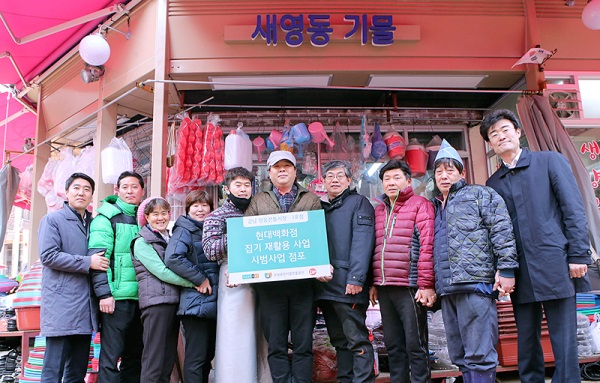 현대백화점은 전통시장 지원을 위한 백화점 집기재활용 사업을 위해 소진공과 함께 지난 6월부터 두 달여간 전통시장을 대상으로 집기지원 신청을 받아 총 3개 전통시장을 선정하여 맞춤형 집기를 리폼제작했다. 특히 집기 디자인, 수선 등은 사회적기업인‘한국 업사이클 디자인협회’가 맡아 의미를 살렸다.