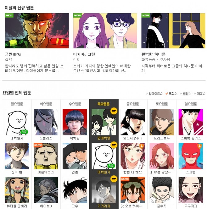 이미지 확대보기<월요웹툰-대학일기, 화요웹툰-노블레스, 수요웹툰-복학왕, 목요웹툰-연애혁명, 금요웹툰-외모지상주의, 토요웹툰-프리드로우, 일요웹툰-스피릿 핑거스>