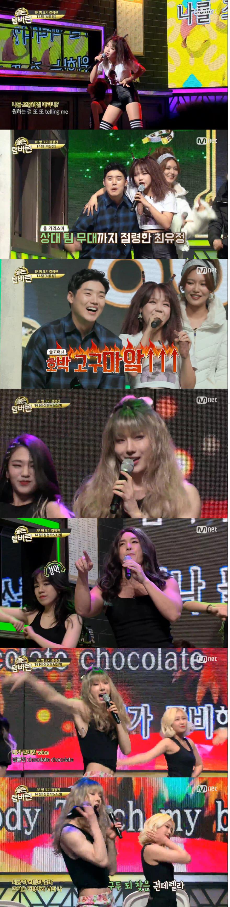 이날 1라운드에서 최유정은 이효리로 변신, 지난 2010년 4월 발표한 '치티치티 뱅뱅'을 부르며 귀여움을 방출했다. 최유정은 노래를 부르는 도중 파격적인 댄스 실력을 과시하며 옆방으로 달려가 권혁수를 도발했다. 특히 최유정은 손에 고구마까지 들고 권혁수의 유행어 "호박고구마!호박고구마!"를 하이 톤으로 연호해 분위기를 고조시켰다.