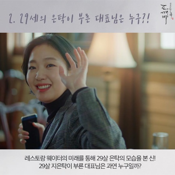 앞서 방송된 6회에서 도깨비 김신은 지은탁과 함께 캐나다 레스토랑에 들어갔다. 그 순간 김신은 레스토랑 웨이터를 통해 지은탁의 29세 된 모습을 내다봤다. 지금 19세인 은탁은 10년 뒤 짧은 단발 머리에 정장을 입고 누군가에게 "대표님"이라며 전화를 걸었다.