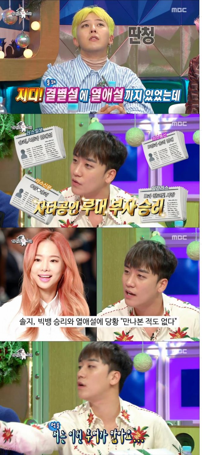 승리는 특히 EXID솔지와 열애설이 나는 등 자신은 알지도 못하는 각종 루머가 불거져 자타공인 루머부자라고 억울해 했다.