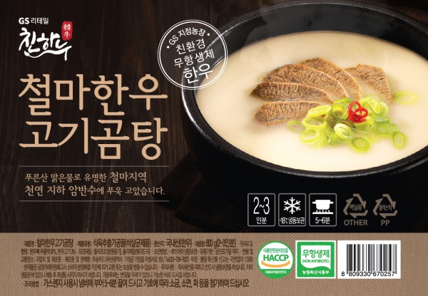 GS리테일이 운영하는 신선∙맛 NO.1 GS수퍼마켓은 전국 점포를 통해 ‘친하누친환경철마고기곰탕’(이하 친환경곰탕)을 출시했다. 친환경한우곰탕은 GS리테일의 친환경 지정목장에서 공수한 친환경 한우의 사골로 고아내 건강하면서도 깊고 진한 맛이 특징이다.