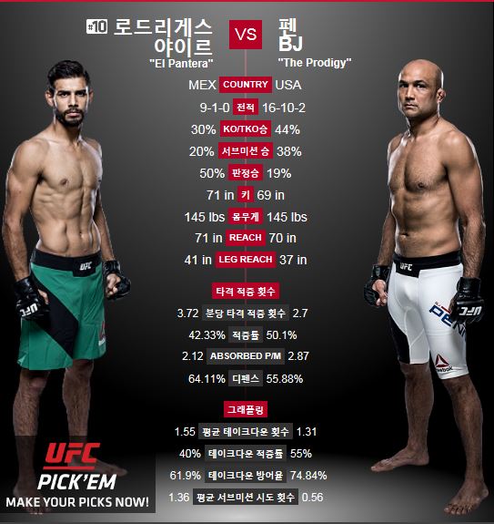 이미지 확대보기한국계 파이터 비제이 펜(38·미국)과 떠오르는 신예 야이르 로드리게스(24·멕시코)의 UFC 경기에 팬들의 관심이 집중되고 있다.