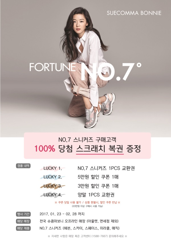 ‘FORTUNE NO.7’프로모션은 슈콤마보니의 스니커즈 중 가장 인기 있는 5개의 스니커즈(매직, 미라클, 스페이스, 헤븐, 스카이)를 구매하는 고객에게 100% 당첨되는 스크래치 복권을 증정하는 이벤트이다. 당첨 경품은 스니커즈 교환권부터 금액 할인권, 양말 교환권까지 다양하게 마련돼 있다.