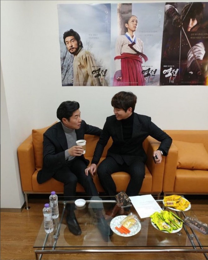 사진 속의 윤균상과 김상중은 '역적' 포스터가 벽에 붙어 있는가운데 간식을 앞에 놓고 놓고 이야기를 나누고 있다. 극중 아모개 역의 김상중은 손에 커피를 들고 진지한 얼굴로 대화를 나누고 있고 길동 역의 윤균상은 웃는 얼굴로 마주 보고 있어서 훈훈함을 더해주고 있다.