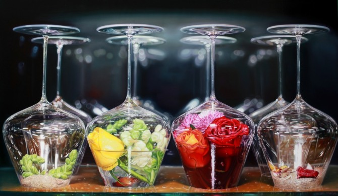 그의 와인잔은 흔들리고 있지만 정지된 순간과 움직임에서 담겨진 시간이 동시에 함축된 연출된 와인잔이다. 순간적이고 영원한 세계에 대한 상징적 표현이다. 그가 그려내는 것들은 단순히 사진처럼 재현해내는 극사실주의가 아니라 사진이 담을 수 없는 이미지나 기억, 순간과 시간 사이에 담겨진 현대인들의 감각, 심상, 흔들리며 살아가는 현대인의 몸짓이다.