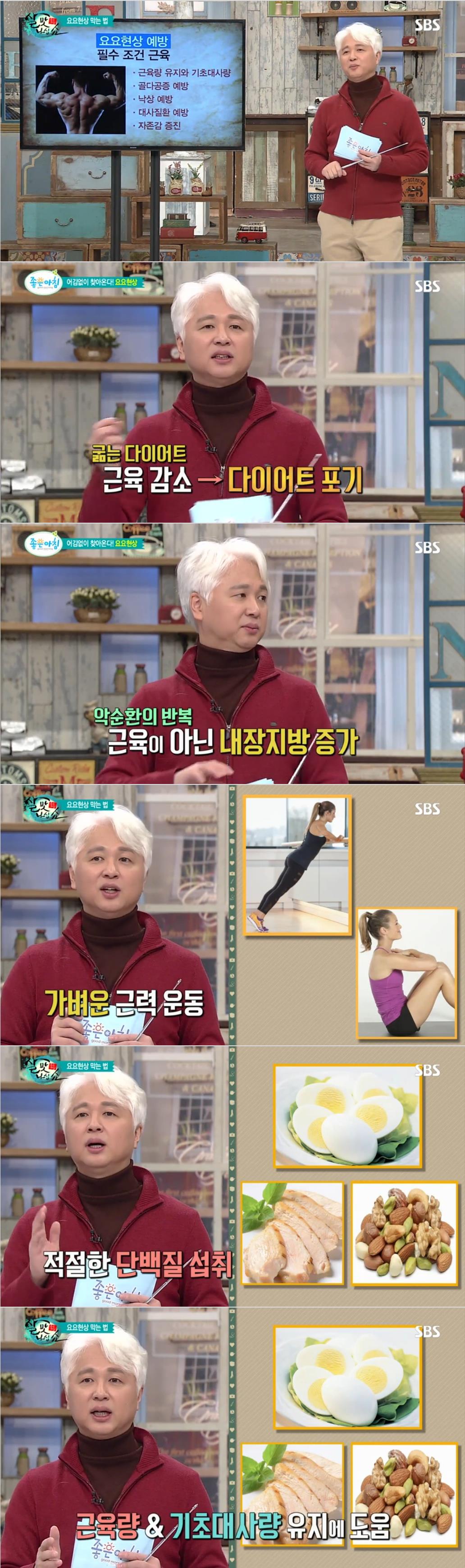 오 교수는 가벼운 근력 운동으로 벽 짚고 '팔 굽혀 펴기', '윗몸 일으키기'를 권했다. 근력운동과 함께 달걀이나 견과류, 닭가슴살 등으로 적절한 단백질을 섭취하면 근육량과 기초대사량을 유지하는 데 큰 도움이 된다고 설명했다. 게다가 근력운동을 하면 골다공증, 낙상을 예방하고 대사질환을 예방하며 살이 빠짐으로써 자존감을 증진시켜 준다고 덧붙였다.