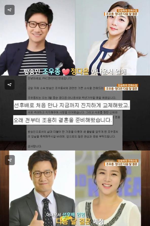 이에 6일 조우종의 여자친구는 정다은 KBS아나운서라는 사실이 밝혀진 가운데 조우종 소속사 FNC 엔터테인먼트는 보도자료를 통해 "조우종이 정다은 아나운와 KBS 아나운서 선후배로 처음 만나 진지하게 교제해왔다"며 "다음 달 중순 백년가약을 맺을 예정"이라고 밝혔다.