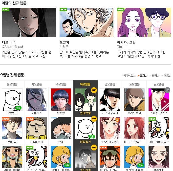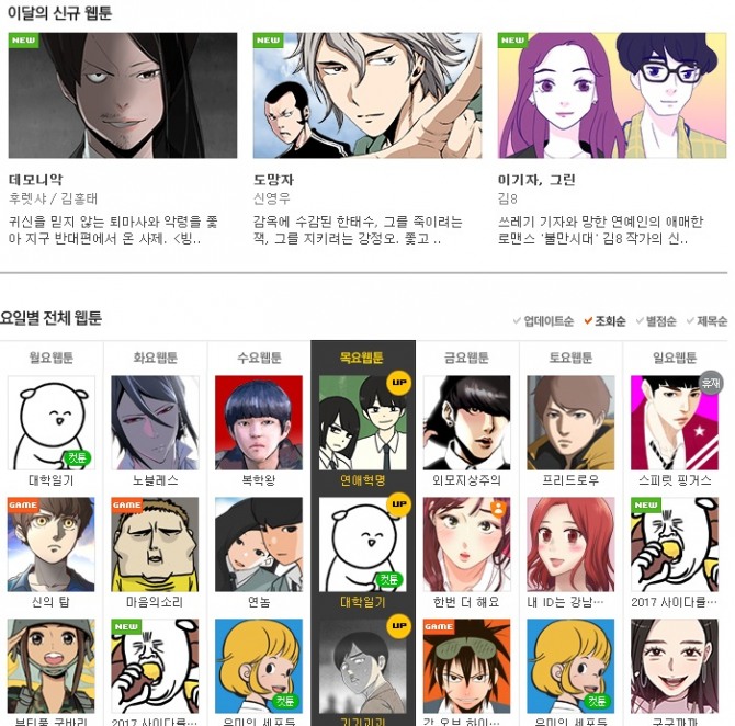 이미지 확대보기월요웹툰-대학일기, 화요웹툰-노블레스, 수요웹툰-복학왕, 목요웹툰-연애혁명, 금요웹툰-외모지상주의, 토요웹툰-프리드로우, 일요웹툰-스피릿 핑거스