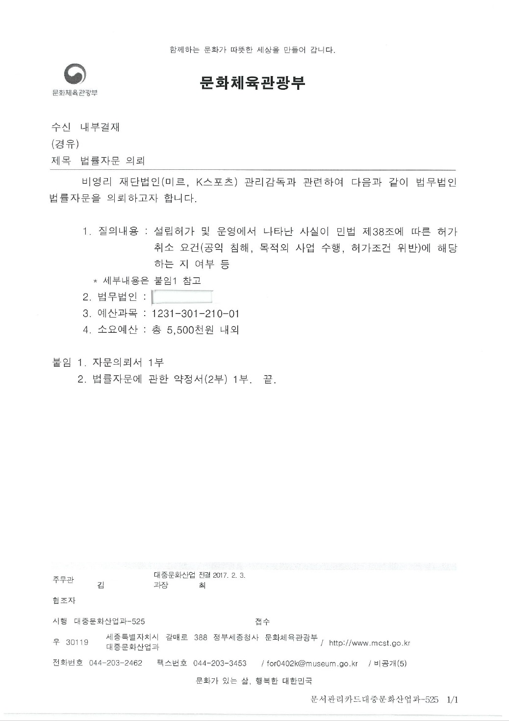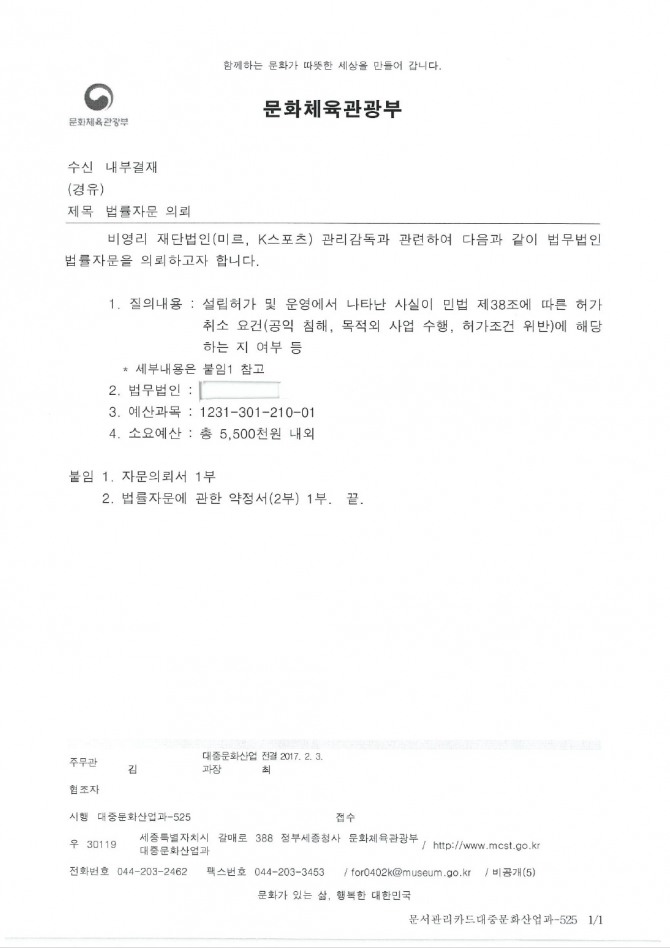 문체부가 제출한 미르재단, 케이스포츠재단 법률자문 의뢰서에 따르면 "미르재단과 케이스포츠재단이 창립총회를 개최하지 않았음에도 불구하고 마치 창립총회가 개최됐던 것처럼 허위로 창립총회 회의록을 작성하여 제출한 사실이 있다"며 미르재단, 케이스포츠재단의 설립 과정의 불법성을 공식화했다.