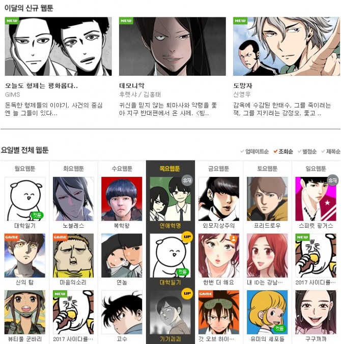 그 뒤를 잇고 있는 조회 순위 2위와 3위는 월요웹툰 ‘신의탑’ ‘뷰티풀 군바리’ / 화요웹툰 ‘마음의 소리’ ‘2017 사이다를 부탁해’ / 수요웹툰 ‘연놈’ ‘고수’ / 목요웹툰 ‘대학일기’ ‘기기괴괴’ / 금요웹툰 ‘한번 더 해요’ ‘갓오하이스쿨’ / 토요웹툰 ‘내 ID는 강남미인!’ ‘유미의 세포들’ / 일요웹툰 ‘2017 사이다를 부탁해!’ ‘구구까까’다.