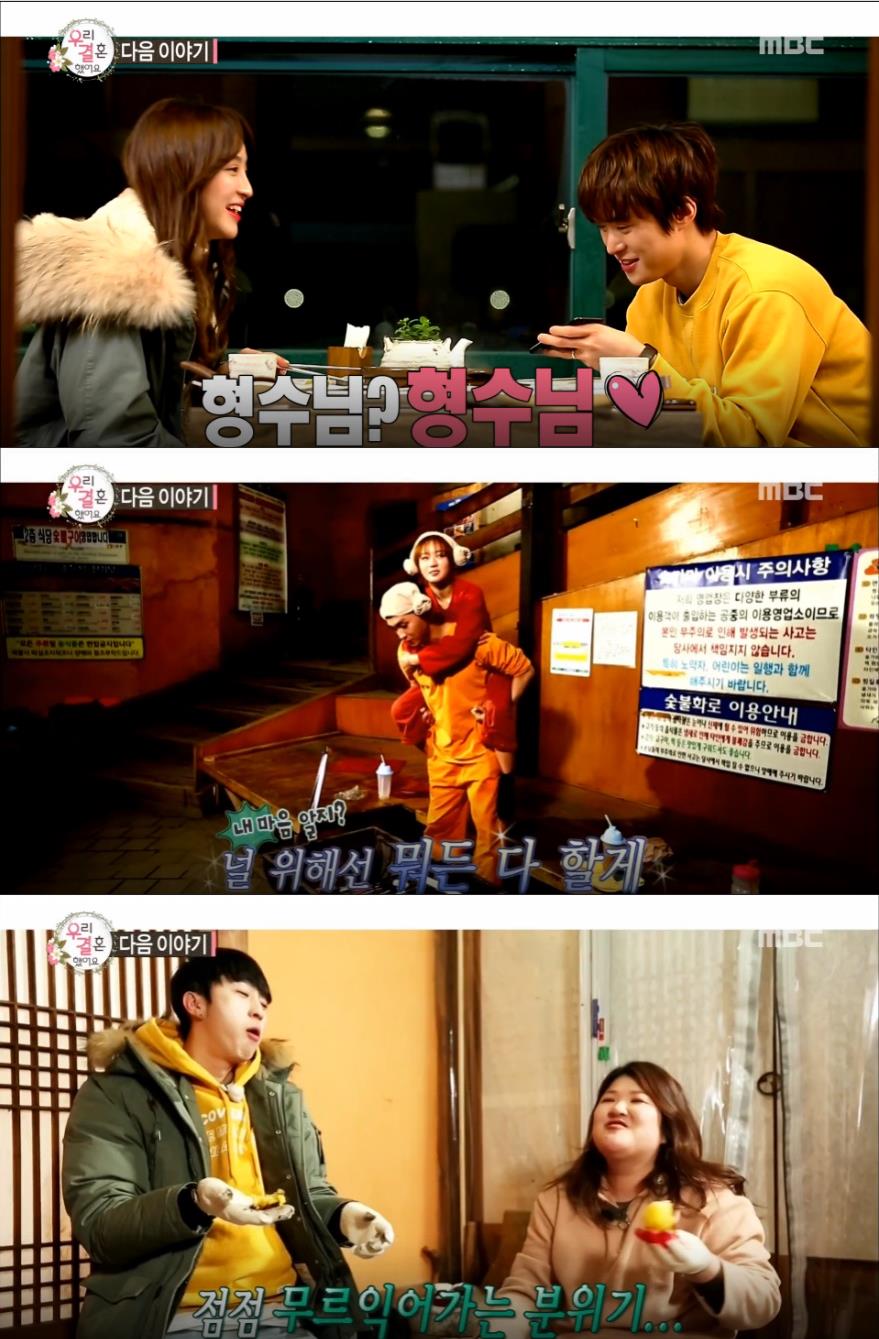 MBC 토요일 예능 ‘우리결혼했어요’ 공식 홈페이지 방송안내에 따르면 공명-정혜성 커플의 강원도 여행 두 번째 이야기, 최태준-윤보미의 숯가마 데이트, 슬리피-이국주 커플의 석모도 여행 이야기를 전한다.