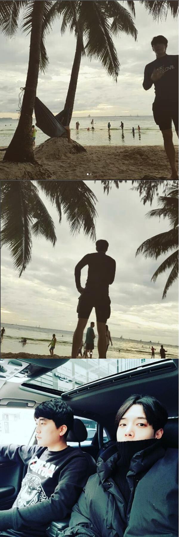 사진 속에는 해변에 서있는 강동호의 모습과 차량을 타고 이동중인 모습이 담겨 있다.