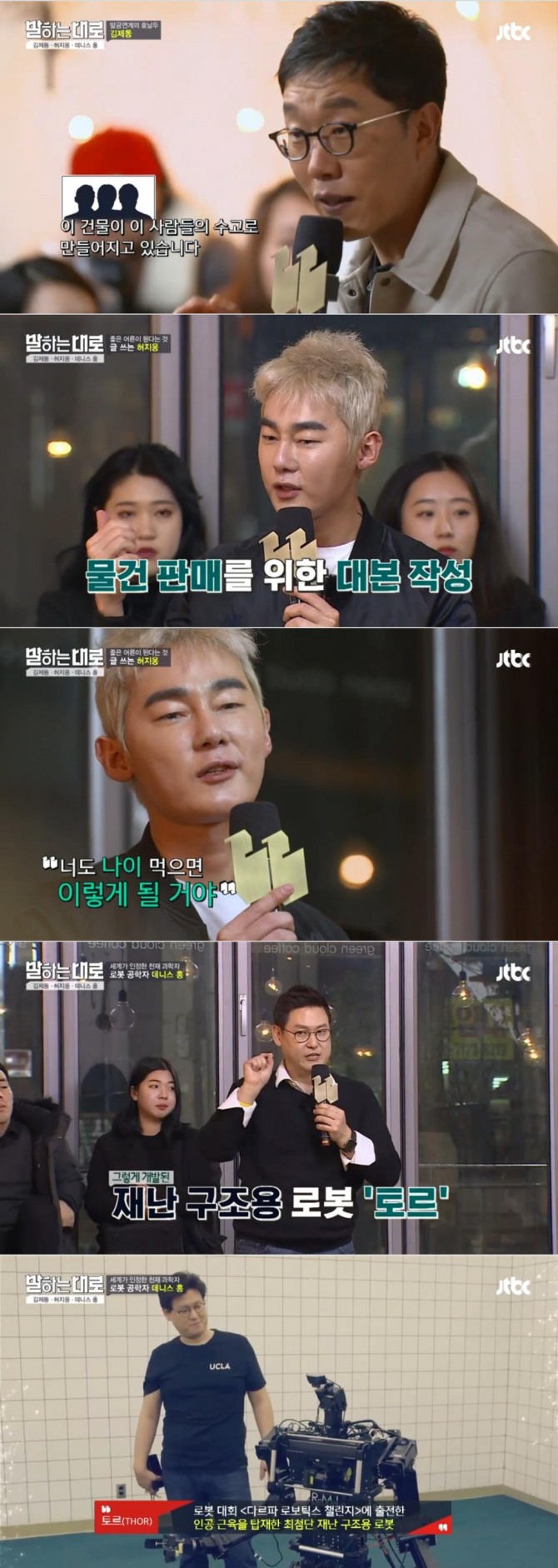 이미지 확대보기1일 방송된 JTBC '말하는 대로'에서는 방송인 김제동, 영화평론가 겸 작가 허지웅, 로봇공학자 데니스 홍이 게스트로 출연해 홍대 앞에서 시민들을 대상으로 사이다 발언을 쏟아냈다.
