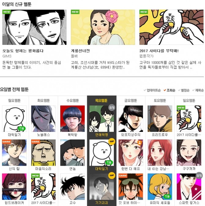 <월요웹툰-대학일기, 화요웹툰-노블레스, 수요웹툰-복학왕, 목요웹툰-연애혁명, 금요웹툰-외모지상주의, 토요웹툰-프리드로우, 일요웹툰-2017 사이다를 부탁해>
