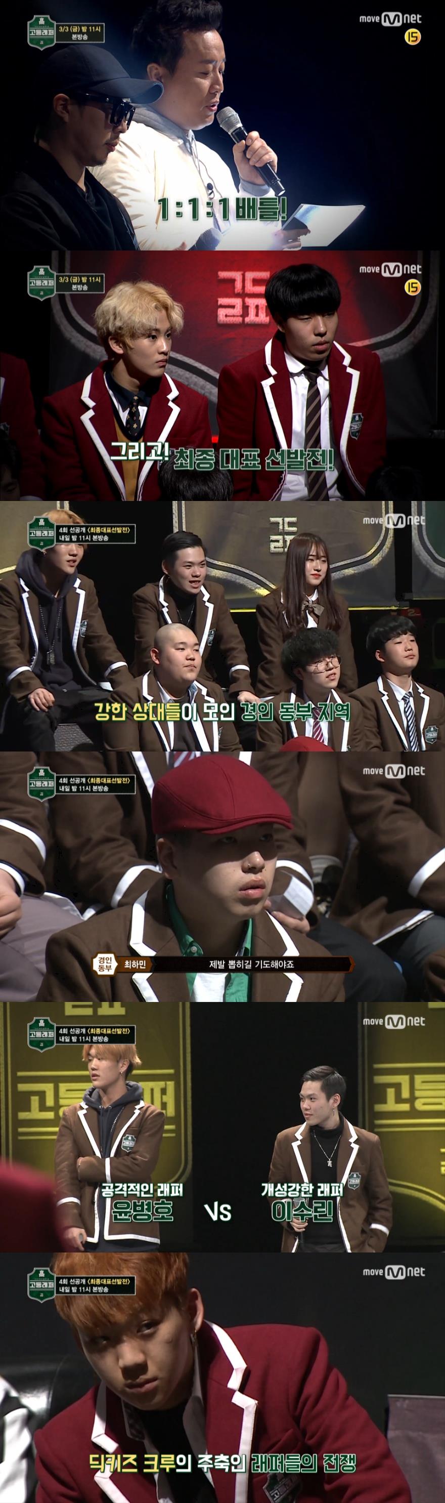 이미지 확대보기3일 방송되는 Mnet '고등래퍼' 4회에서는 6개 지역 대표 TOP9으로 뽑힌 래퍼들이 '1:1:1' 배틀을 벌여 지역 대표 래퍼로 3명을 선발하는 장면이 그려진다. 또 이날 방송에서는 각 지역별 고등래퍼 대표 3인과 멘토들의 매칭 결과도 함께 공개된다.