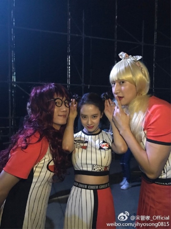 사진에는 '런닝맨' 멤버들이 최근 대만 팬미팅 '런닝맨 2017 라이브 투어' 에 오른 모습이 담겨 있다. '런닝맨' 송지효는 지석진, 이광수는 치어리더 옷을 입고 걸그룹 트와이스로 변신했다.