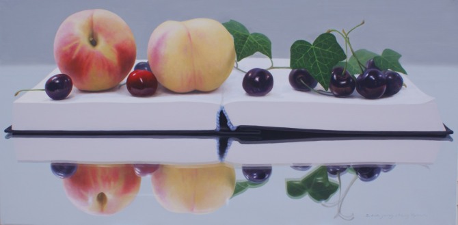 화려하지만 변할 수밖에 없는 자연물, 변함없이 인간을 숙성시키는 지혜가 담긴 책 등의 소재는 작가의 눈과 거울을 통해 반복적으로 그 환영이 전해지고 영혼이 담긴 붓질을 통해 작품의 명제이기도 한 ‘명경지수(明鏡止水)’, 인간의 맑은 심성을 보여준다. 정신적 피폐함과 일상의 위태로운 상황을 정화시키고 맑음을 추구하는 투명한 거울 위에, 다산과 부귀 등 일상적 의미를 지닌 사물을 통해 밝고 아름다운 인간 내면의 성숙함을 표현해내고 있다.
