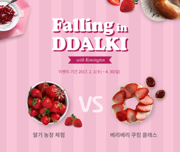 이랜드가 운영하는 켄싱턴리조트가 봄을 맞아 딸기 체험 프로모션 ‘폴링인딸기(Falling in DDALKI)’를 선보인다고 10일 밝혔다. 폴링인딸기는 아이들이 자연 속에서 딸기를 수확하고 맛볼 수 있는 ‘딸기 따기 체험’과 직접 딸기 디저트를 만들 수 있는 ‘쿠킹클래스’ 패키지로 구성됐으며, 켄싱턴리조트 설악비치점, 충주점, 청평점, 남원점, 제주 서귀포점 등 전국 5개 지점에서 4월 30일까지 진행된다.