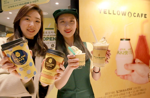 ‘빙그레 옐로우카페 컵 음료’는 빙그레가 새롭게 선보이는 음료 브랜드로, ‘바나나티라미수(2300원)’와 ‘소금라떼(2300원)’ 2종으로 구성됐다. 출시를 기념해 판교점 지하 1층 식품관에서 '옐로우 카페' 팝업스토어를 열고 소프트아이스크림이나 바나나쉐이크를 구매한 고객에게 '옐로우카페 컵 음료'를 사은품으로 증정한다.