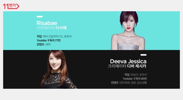 이미지 확대보기인기 유튜브 스타의 ‘먹방’(먹는 방송)을 11번가에서 생방송으로 진행하는 첫 사례다. 생방송은 오는 17일과 24일 오후 9시부터 2시간 동안 각각 ‘디바 제시카 & 이사배와 함께 먹어요!’, ‘디바 제시카 & 이사배와 함께 메이크업!’을 주제로 선보인다. 두 사람은 방송을 통해 혼자 먹기 아까운 맛있는 식품들과 봄 메이크업에 대해 소개할 예정이다.