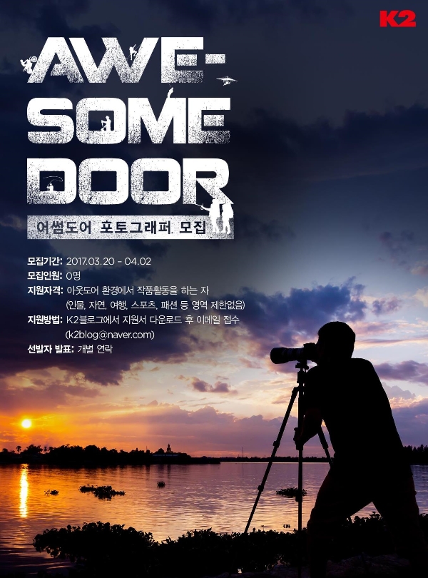 K2가 사회 공헌 캠페인 ‘K2 어썸도어’에 참여할 아웃도어 포토그래퍼를 내달 2일까지 모집한다. 어썸도어는 K2가 2013년부터 다양한 분야의 아웃도어 전문가를 선정, 도전을 이어나갈 수 있도록 지원해 온 캠페인이다. 어썸도어 포토그래퍼로 선정되면 K2 신제품 연중 지원, 할인 혜택 제공 및 공동 프로젝트를 진행할 수 있는 기회 부여 등 다양한 혜택이 주어진다.