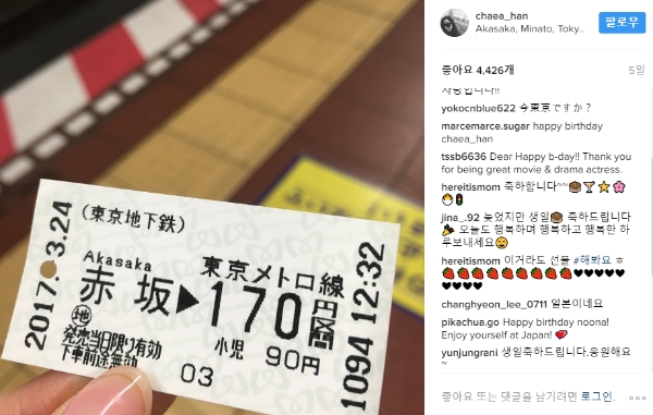 해당 사진은 일본의 도쿄 메트로 선 지하철 티켓으로 날짜도 지난 24일이라고 적혀 있다. 한채아는 당시 도쿄 아카사카 지역을 여행 중이었던 것으로 보여진다.