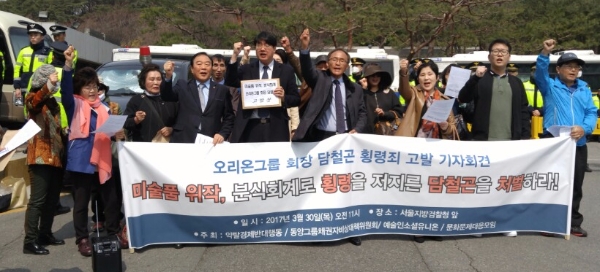 이미지 확대보기30일 약탈경제반대행동, 동양그룹채권자비상대책위원회, 예술인소셜유니온, 문화문제대응모임 등 4개 시민단체는 담철곤 오리온그룹 회장을 횡령 혐의로 고발했다.