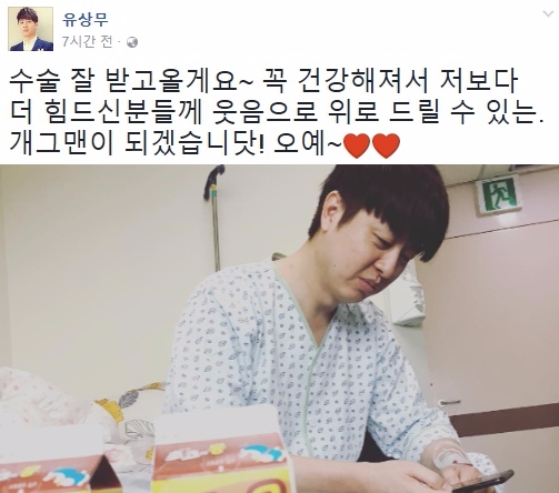 이미지 확대보기유상무는 이날 자신의 페이스북에 "수술 잘 받고 올게요"라며 "꼭 건강해져서 저보다 더 힘드신 분들께 웃음으로 위로 드릴 수 있는 개그맨이 되겠습니다"라고 인사를 전했다.