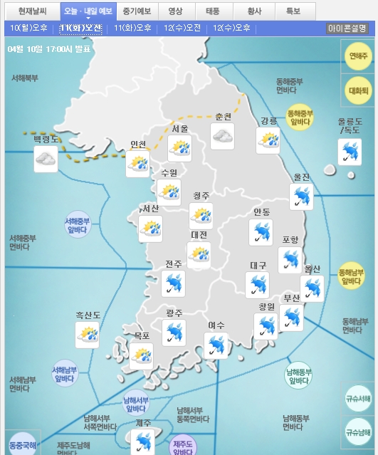 이미지 확대보기비는 강원남부와 충청도, 남부지방, 제주도는 오전에 내리겠다.