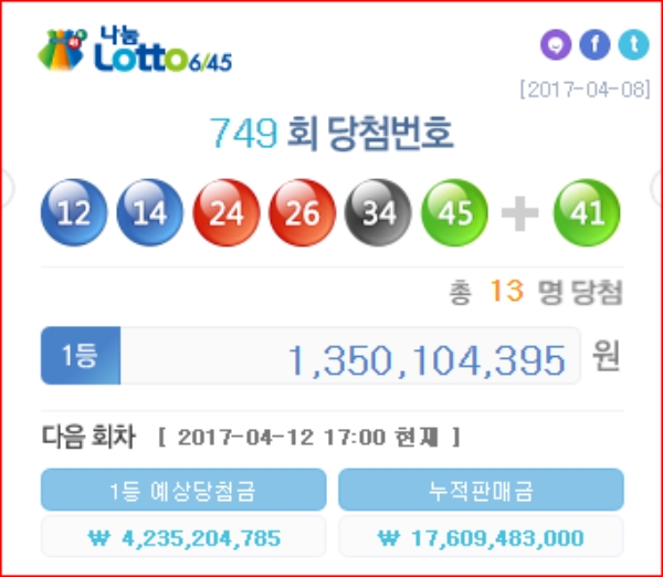 이미지 확대보기749회 로또 당첨번호는 12 14 24 26 34 45 보너스번호 41번으로 번호가 고르게 나왔다. 파란·빨간·연두색 2개, 검정색 1개다.